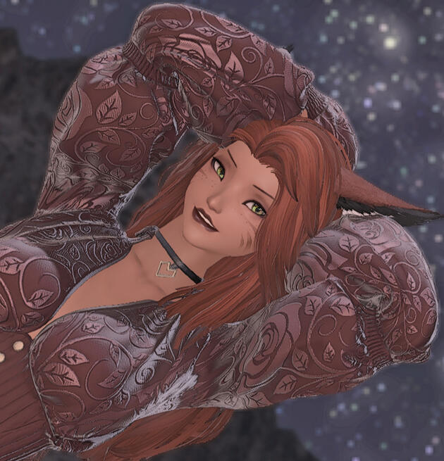 you can usually find me in game running around and doing silly stuff with my pals! i also work at the femme fatale during their openings as a healer for any injured fighters. if you see me gposing somewhere, don't be shy and say hi!